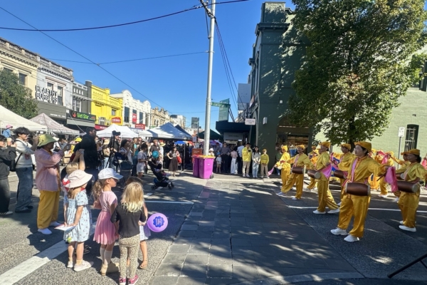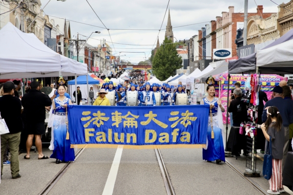 2026年3月29日,墨爾本格倫費里嘉年華(Glenferrie Festival)在霍桑區(Hawthorn)格倫費里街舉辦,活動由法輪大法天國樂團遊行開場。(Bill Liu/大紀元)