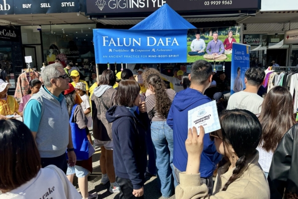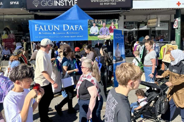 2026年3月29日,墨爾本格倫費里嘉年華(Glenferrie Festival)在霍桑區(Hawthorn)格倫費里街舉辦,法輪大法展位前行人絡繹不絕。(Claire Liu/大紀元)