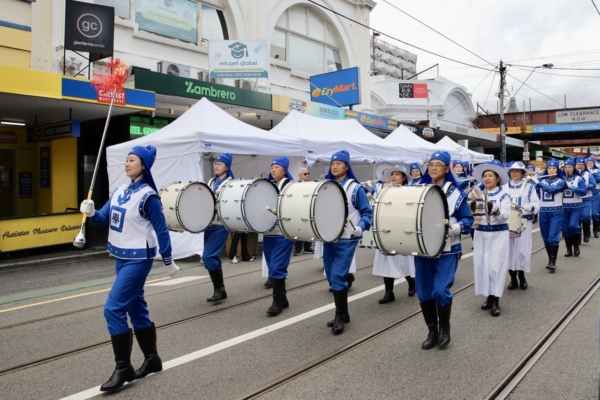 2026年3月29日,墨爾本格倫費里嘉年華(Glenferrie Festival)在霍桑區(Hawthorn)格倫費里街舉辦,慶典由法輪大法天國樂團遊行開場。(Bill Liu/大紀元)
