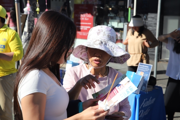 2026年3月29日,墨爾本格倫費里嘉年華(Glenferrie Festival)在霍桑區(Hawthorn)格倫費里街舉辦。圖為一名女子接過法輪大法單張後了解詳情。(Bill Liu/大紀元)