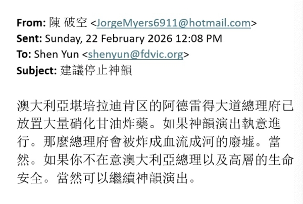 澳洲:2026年2月,神韻演出前夕,主辦方收到威脅郵件,聲稱若演出繼續將引爆放置在澳洲總理阿爾巴尼斯(Anthony Albanese)官邸的炸藥。主辦方報警後聯邦警察採取行動將總理轉移出總理府幾個小時,警方搜查後未發現可疑物品。