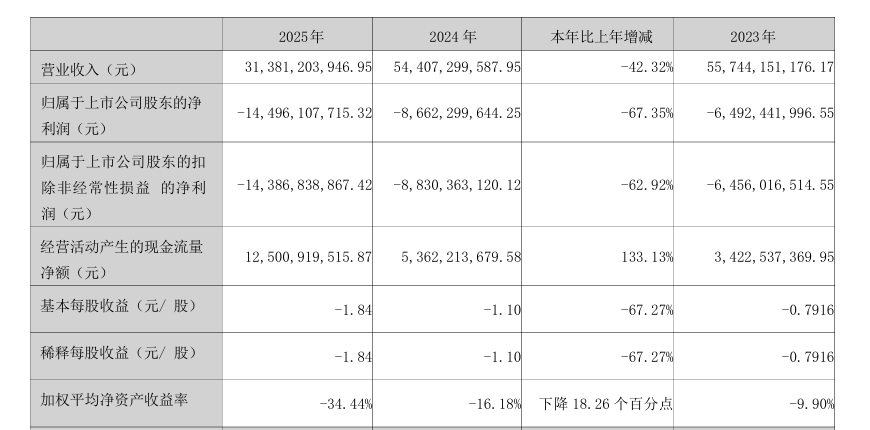 另外,歸屬於上市公司股東的扣除非經常性損益的淨利潤為虧損143.86億元,同比下降62.92%;總資產約2803億元,同比減少13.51%;歸屬於上市公司股東的淨資產約387.23億元,同比減少27.2%;截至2025年末,有息負債總額1,185億元,其中中長期借款佔比69%。