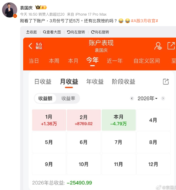 微博原創影片博客、微博大V「袁國慶」發出虧錢截圖說,「剛看了下帳戶,3月份虧了近5萬。還有比我慘的嗎?」