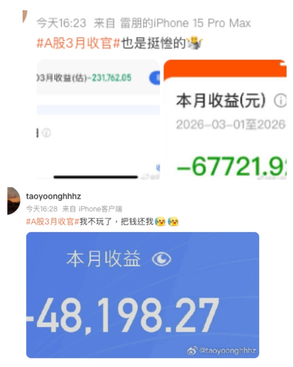 A股表現再度衝上微博熱搜,標籤為「A股3月收官」的話題下,眾多股民紛紛晒出自己的虧損單,「也是挺慘的(虧67721元)」「我不玩了,把錢還我(虧48198元)」。