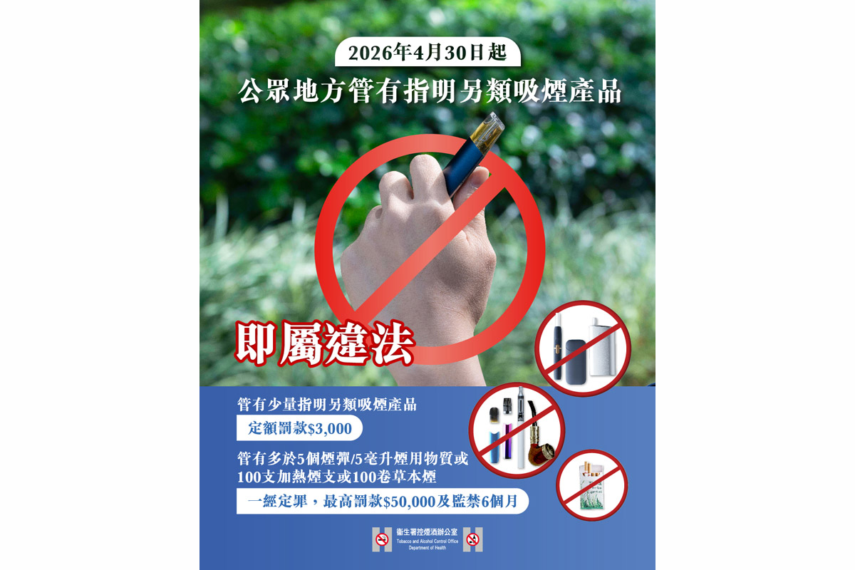 衞生署今日(2日)在社交平台發文,提醒市民由今年4月30日起,只要在公眾地方管有指明另類吸煙產品,包括電子煙煙彈、煙油、加熱煙和草本煙,就算是隨身攜帶而未有吸食或使用,都屬於違法。