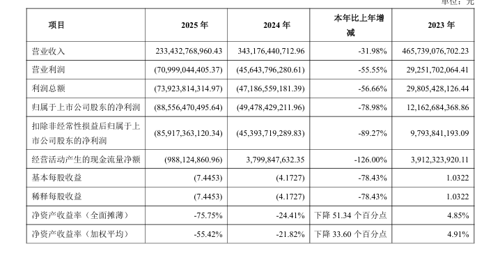 4月1日,萬科發布了《2025年度報告摘要》。該公告顯示:「2025年,本集團實現營業收入2,334.3億元,歸屬於上市公司股東的淨虧損885.6億元,同比分別下降32.0%和79.0%;基本每股虧損7.45元,同比下降78.4%。」而虧損885.6億元創下了萬科上市以來最為慘澹的成績單。