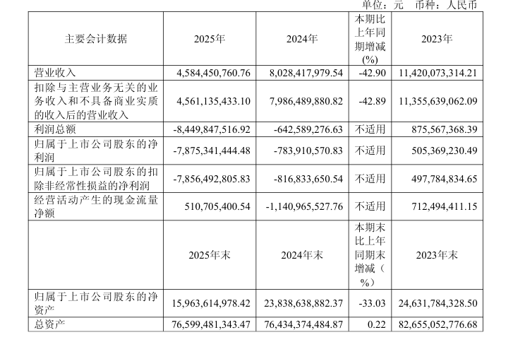 信達地產4月2日發布了《2025年年度報告》。報告顯示:「報告期內,公司實現營業收入45.84億元,較上年同期80.28億元下降42.90%;實現淨利潤-87.23億元,較上年同期-8.09億元減少79.14億元;實現歸屬母公司淨利潤-78.75億元,較上年同期-7.84億元減少70.91億元。」