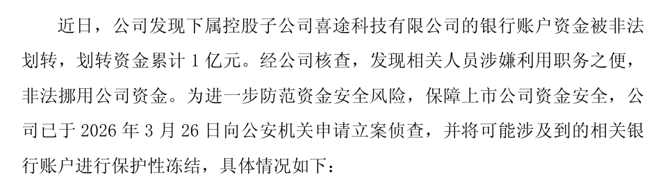 事件起因源於3月27日,當晚,喜臨門發布了《關於公司控股子公司帳戶資金被非法劃轉及部份銀行賬戶被保護性凍結的公告》。公告表示:「公司發現下屬控股子公司喜途科技有限公司的銀行賬戶資金被非法劃轉,劃轉資金累計1億元。經公司核查,發現相關人員涉嫌利用職務之便,非法挪用公司資金。」而且「公司已於2026年3月26日向公安機關申請立案偵查,並將可能涉及到的相關銀行賬戶進行保護性凍結。」