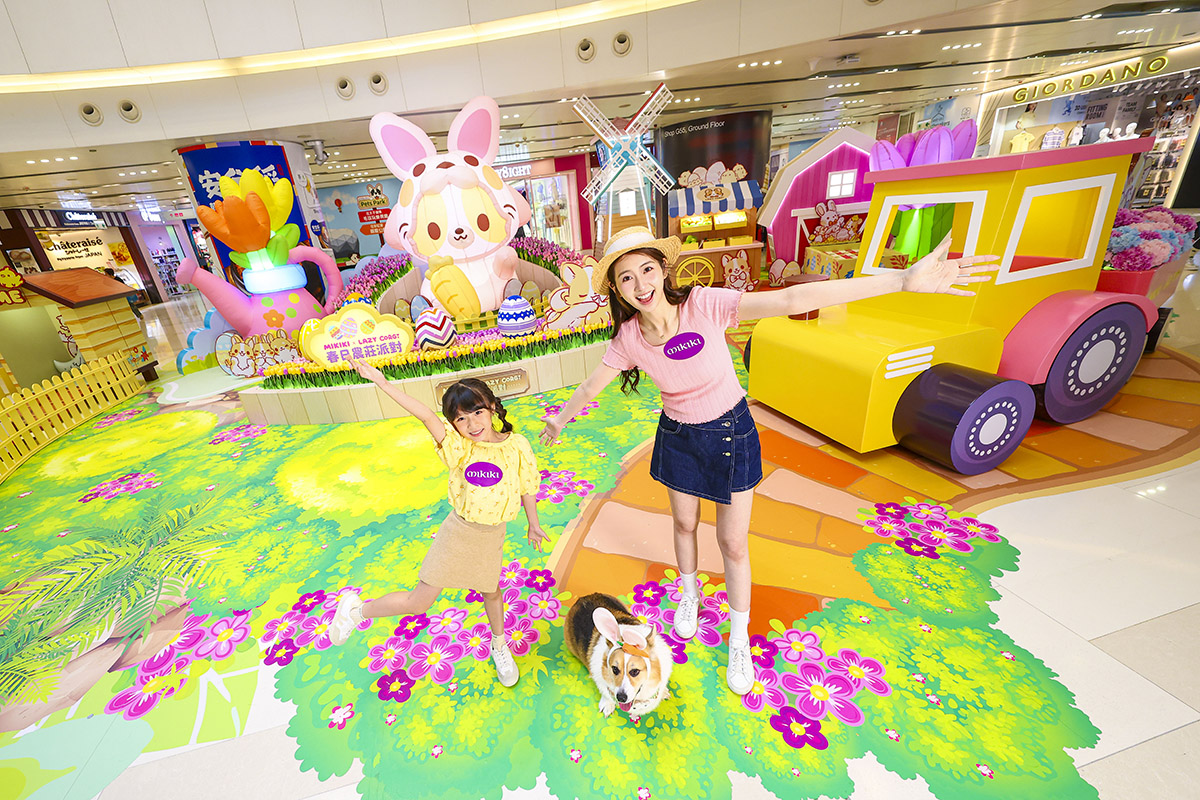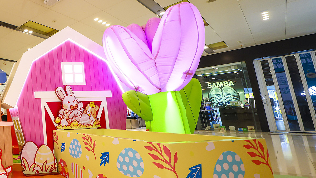 商場中庭是全場焦點——3.5米高巨型充氣「Lazy Corgi」換上超萌復活兔裝束,懶洋洋地抱著紅蘿蔔坐在農莊中央,腳下是一一圈圈仿真鬱金香花圃,粉紫、粉紅及嫩黃交錯綻放。