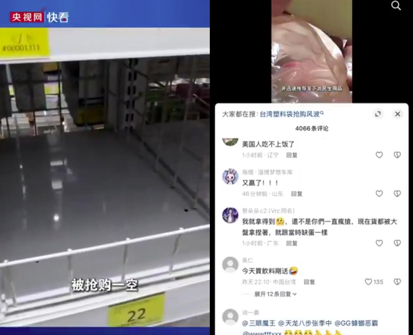 4月2日,中共官媒央視報道稱,中東戰事衝擊供應鏈,導致台灣市場出現膠袋及垃圾袋短缺,「民眾有錢也難以購買」。相關畫面顯示貨架空置,並配以「被搶購一空」等表述。消息傳播後迅速引發質疑,多名台灣網民公開否認相關情況。分析認為,中共炒作別有用意,是想通過「外部更糟」的敘事來轉移內部壓力。