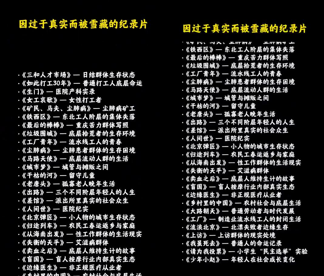據這份清單顯示,相關作品橫跨近三十年,涵蓋農民工、塵肺病患者、基層執法、流動人口、歷史創傷等題材,包括《三和人才市場》《最後的棒棒》《鐵西區》《上訪》《差館》《人間世》《請為我投票》紀錄片等。多數作品曾在影展或小範圍傳播,但在中國大陸難以持續公開呈現。