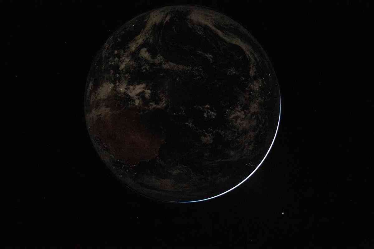 另一張照片(下圖)拍攝時間僅相隔幾分鐘,快門速度更短。據美國太空總署稱,這張照片突出了地球的夜空光芒。可以看到電燈的光芒點綴著地球,而陽光則照耀著地球的邊緣。