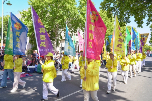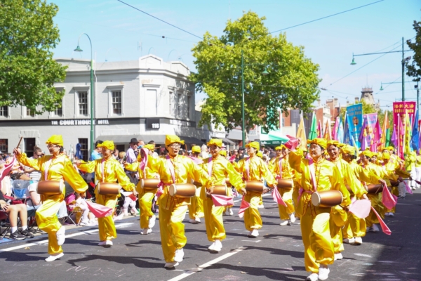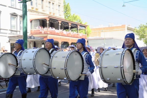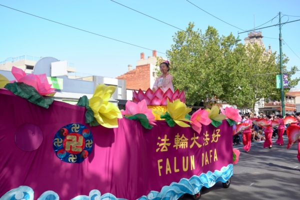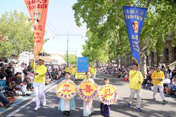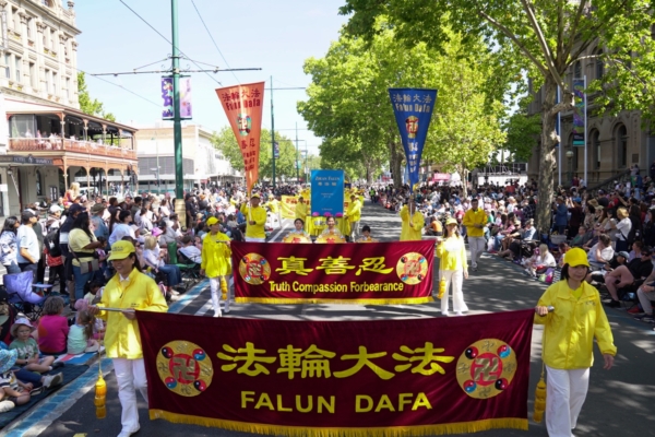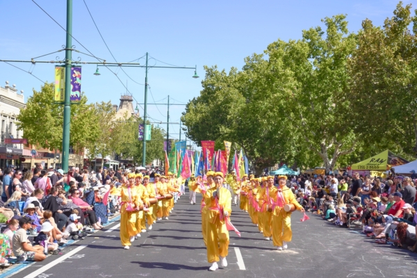 遊行從中午12點30分正式開始,來自墨爾本、悉尼的百名法輪大法學員分成十多個主題隊伍,從班迪哥View Street街出發,在兩側人群的掌聲和歡呼聲中緩緩行進。