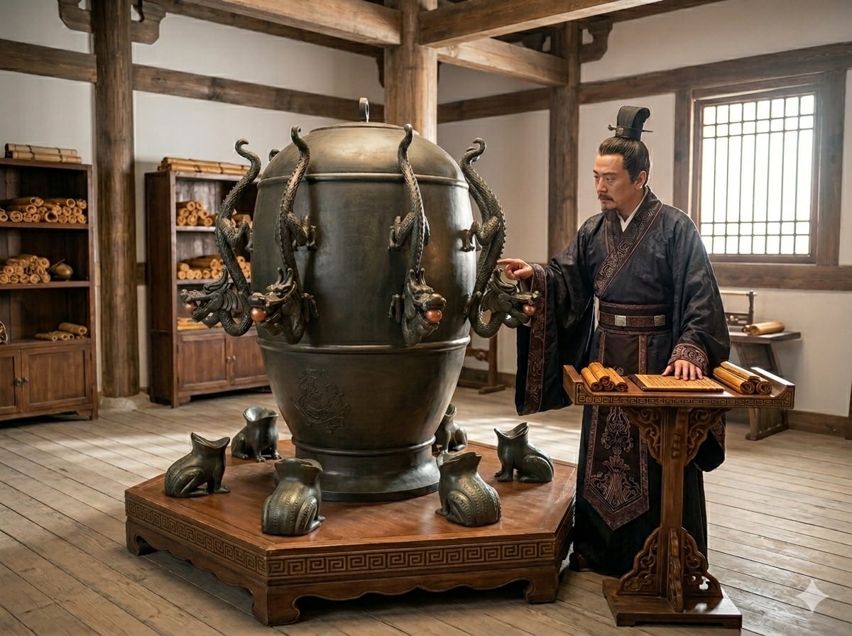 古籍《後漢書》記載:後漢人張衡,字平子。他製造了一台候風地動儀。地動儀是用精煉的銅鑄成的。圓徑八尺,蓋合高隆起來,形狀像個大酒杯。上面繪製有篆文、山龜、鳥獸等圖案作為裝飾。中間有一根總柱和周圍八根分柱用機關相連接。外有八個龍頭。每頭龍口中含一枚銅丸,下面有蹲伏著的蟾蜍,張口接著。