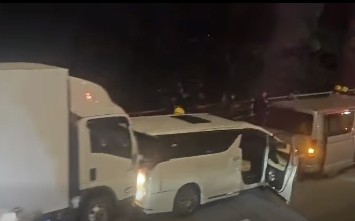 同晚11時許,一輛49歲大陸男子駕駛小巴沿新田公路往上水方向行駛,懷疑收掣不及,撞向前面一輛中型貨車及一輛輕型貨車車尾,中型貨車再撞向一輛私家車車尾,私家車被推前撞向一輛中型貨車。