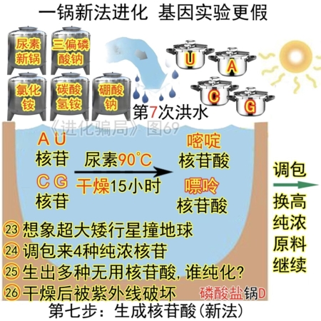 假設33:洪水把C鍋的微量核苷衝入D鍋,同時衝來濃尿素,然後加熱到85℃乾燥20小時,就能生成4種核苷酸——實際不可能,自然界沒有純濃尿素,一鍋反應的微量原料(核苷),在洪水下損失(至少99%,前文已實驗)沒了,除非調包來4鍋純濃核苷。