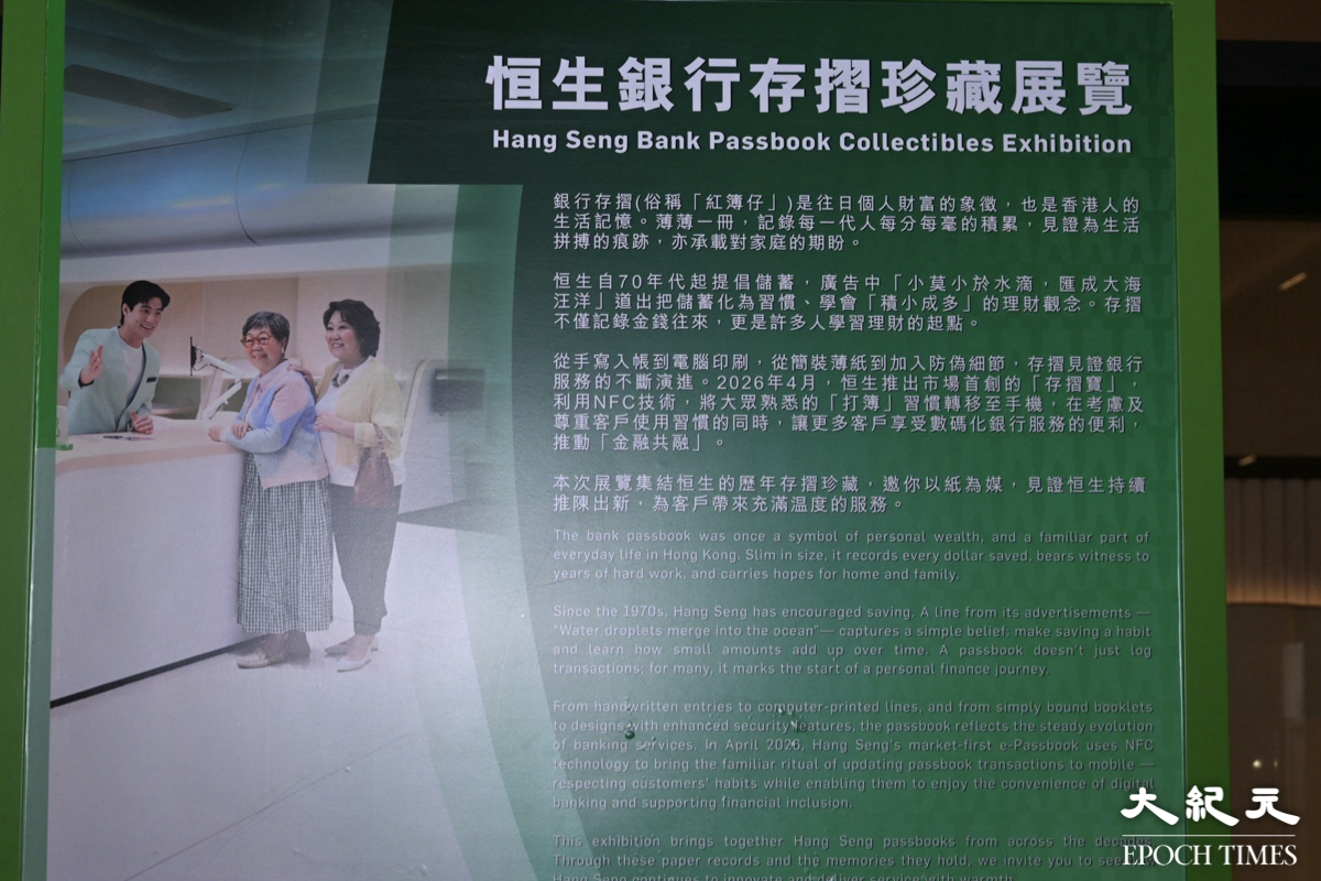 由即日起,客戶可攜同支援NFC功能的手機到恒生分行辦理「存摺寶」服務。恒生亦於即日起至5月7日期間,在中環總行地下舉行「恒生銀行存摺珍藏展覽」,展出多款具歷史價值的存摺珍藏。@