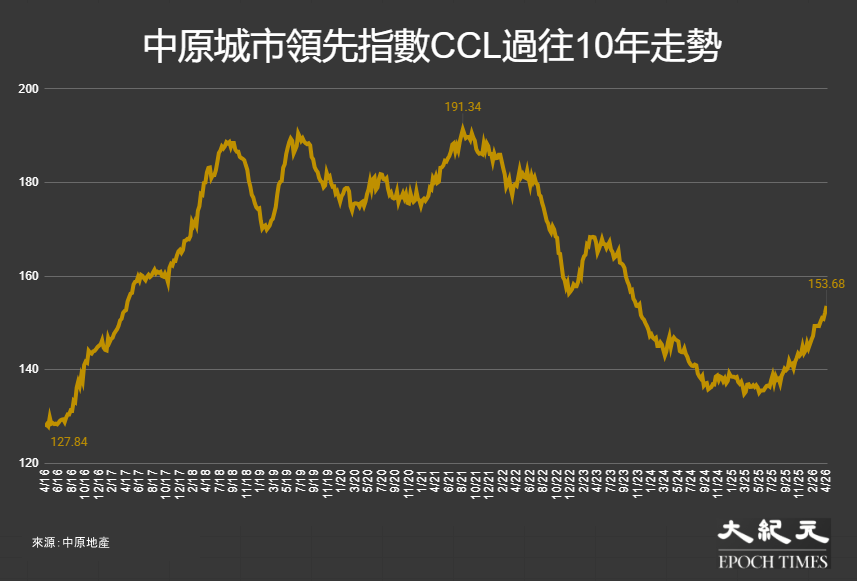 追蹤香港二手樓價的中原城市領先指數CCL於10日公布最新的數值為153.68點,截至4月5日,按周指數上升0.99%,按月則升2.25%,自疫情爆發以來(2020年1月26日起)跌13.46%,而3年的累積跌幅為8.67%。大型、中小型單位按周分別錄得上升2.28%、升0.74%,3年累積跌9.78%、跌8.45%。