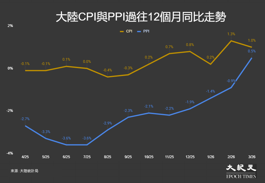 大陸統計局於10日公布最新居民消費價格指數(CPI),3月份環比錄得通縮0.7%;同比報通脹1.0%,低於市場原本預測CPI將升1.2%,上月按年走高1.3%,本月數值創自2023年2月以來最高。