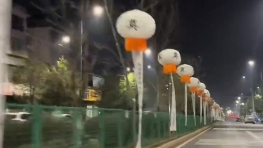 網傳的影片顯示,該路段綠化帶區域緊鄰私家車道,燈籠就插在綠色護欄上。每個燈籠足有兩米多高,上面赫然寫著一個「奠」字,下方懸掛著長長的白色直幡。沿路百餘米,都掛滿這樣的燈籠,形成一條長長的「燈籠陣」,讓人看了心裏發毛,不少路過司機直呼「瘮得慌」。