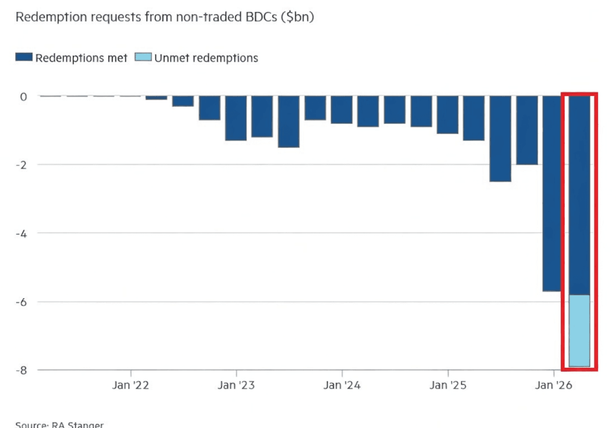 這種不確定性引發了贖回請求(redemption request)激增。2025年末和2026年初,主要參與者的贖回請求均出現大幅增長。藍色貓頭鷹資本(Blue Owl)面臨的贖回壓力,迫使其出售了價值14億美元的資產,並最終限制了季度贖回。