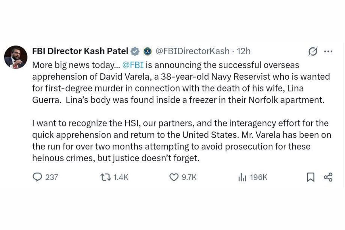 涉案疑犯為38歲的美國海軍預備役軍人David Varela,他被指控與其39歲妻子Lina Maria Guerra的死亡有關,並涉及一級謀殺罪。FBI局長帕特爾於社交平台X發文指出,經過跨機構的合作,當局已在海外成功將逃亡逾兩個月的Varela拘捕。美國司法部隨後亦確認,疑犯目前已返回美國並正被還押。