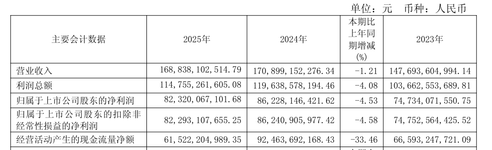 貴州茅台4月17日發布了《2025年年度報告》。報告顯示,2025年營業收入168,838,102,514.79元(人民幣,下同),2024年170,899,152,276.34元,同比下滑1.21%;利潤總額114,755,261,605.08元,2024年119,638,578,194.46元,同比下滑4.08%;歸屬於上市公司股東的淨利潤82,320,067,101.68元,2024年86,228,146,421.62,同比下滑4.53%;歸屬於上市公司股東的扣除非經常性損益的淨利潤82,293,107,655.25元,2024年86,240,905,977.42元,同比下滑4.58%。