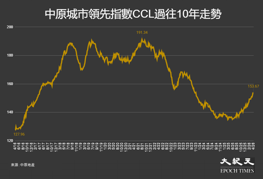 中原地產研究部高級聯席董事楊明儀指出,美伊戰局未明,恒指大幅波動,影響CCL連升兩周後出現高位整固,但本地樓市氣氛仍然向好,多個新盤銷情不俗,拆息下降並一度跌至1.95厘,銀行推出按揭優惠計劃,增強二手買家的入市意欲,故指數跌幅輕微,仍為2023年11月中後126周次高。第二季CCL目標156點水平,只要再升2.33點便達到。
