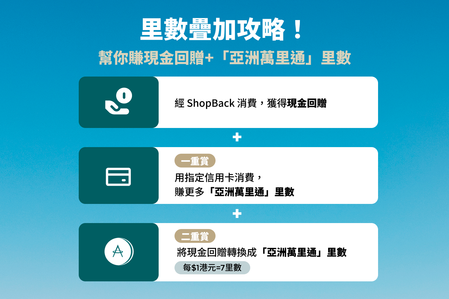 消費者現可透過ShopBack平台疊加多重獎賞,於日常消費中獲取最高回贈。在單一次交易中,用戶不但能享受商戶提供的獨家優惠,還可於合資格的消費中賺取現金回贈,同時累積信用卡里數或積分。而用戶累積所得的現金回贈,現在更可直接轉換為「亞洲萬里通」里數,帶來回贈更豐厚、更流暢無縫的購物體驗。