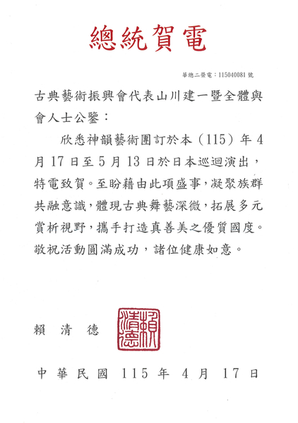 台灣總統賴清德 祝神韻藝術團日本演出圓滿成功
