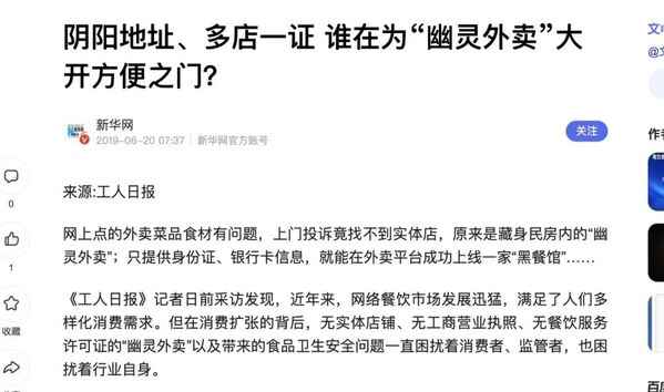 報道提及,早在2019年6月,官媒新華網在一篇《陰陽地址、多店一證 誰在為「幽靈外賣」大開方便之門?》(轉自《工人日報》)文章中明確提到,沒有實體店舖、沒有工商營業執照、沒有餐飲服務許可證的「幽靈外賣」,被大開方便之門。