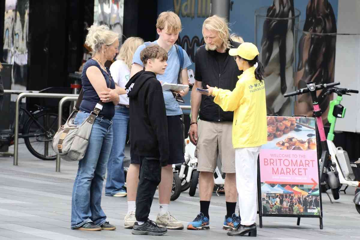 廣場上「世界需要真、善、忍」「紀念法輪功學員4.25和平上訪27周年」「法輪大法好」等橫額醒目耀眼,許多人了解真相後,在徵簽簿上簽名,呼籲制止對法輪功的迫害。