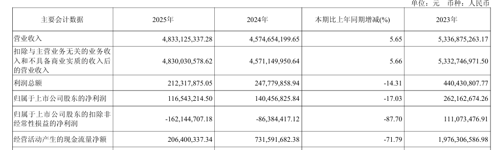 中國電影4月18日對外發布了《2025 年年度報告》。報告表示:「 營業收入4,833,125,337.28元,同比增加5.65;利潤總額212,317,875.05元,同比減少14.31;歸屬於上市公司股東的淨利116,543,214.50元,同比減少17.03;歸屬於上市公司股東的扣除非經常性損益的淨利潤虧損162,144,707.18,同比減少87.70。」