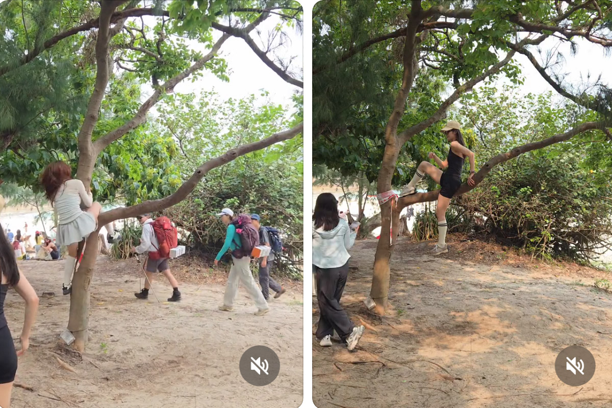 網上影片顯示,數名操普通話的女子在西貢浪茄灣沙灘攀爬幼樹。片中可見,有穿著熱褲或短裙的女子無視樹幹上的危險警告膠帶,手腳並用爬上樹丫坐著或躺臥拍照,過程中甚至不慎露出打底褲。更有遊客以雙手吊掛在脆弱的樹丫上,身體前後擺動,將樹枝當作「引體上升」的工具,導致幼樹劇烈晃動,行徑令在場人士側目。
