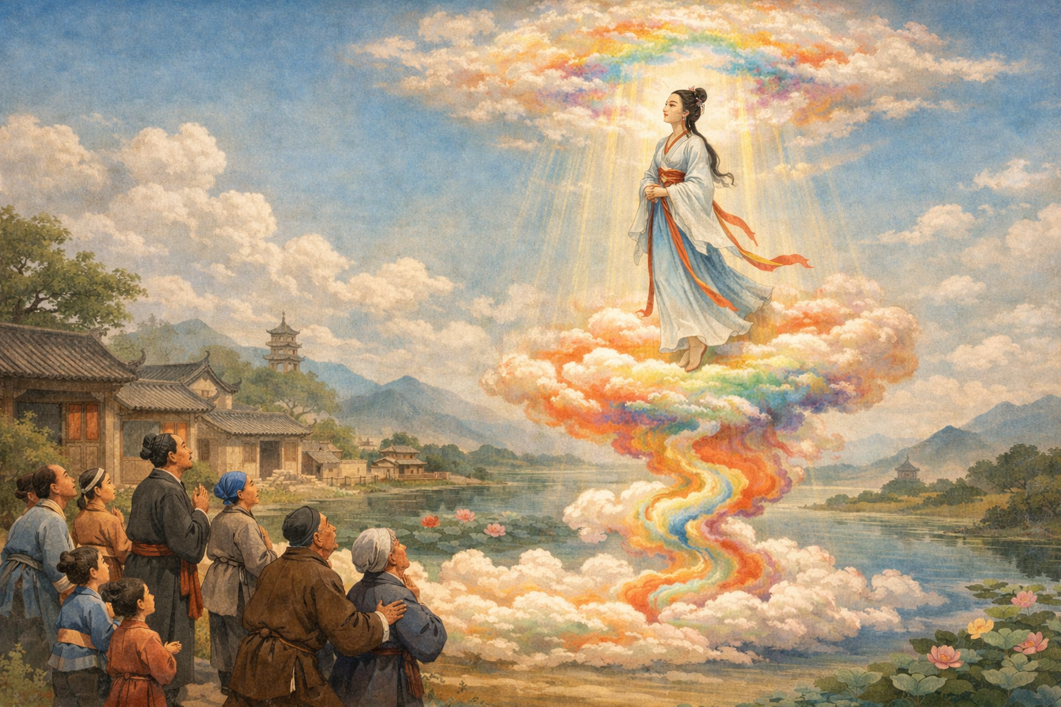 某天正午,鄉里的人忽然看見空中垂下一朵五色祥雲,吳氏緩緩踏上雲端,冉冉升天而去。鄰居吃驚地跑去王家報信:「婆婆!妳媳婦成仙啦!她登天啦!」