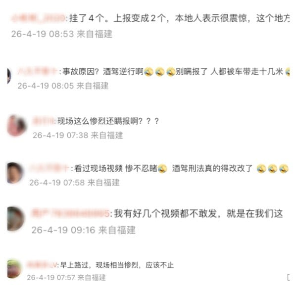 在微博上,IP地址來自福建的網民表示見過現場,並指控官方瞞報,「掛了4個。上報變成2個,本地人表示很震驚,這個地方關係真硬。」「我有好幾個影片都不敢發,就是在我們這。」「現場這麼慘烈還瞞報啊???」