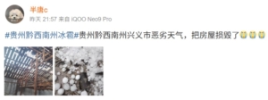 據多名網民發布影片和圖片表示,19日,貴州六盤水、興義等多地遭遇強對流天氣,降下雞蛋大小的冰雹,持續一個多小時,導致多戶村民房屋屋頂被砸穿、車輛擋風玻璃受損。