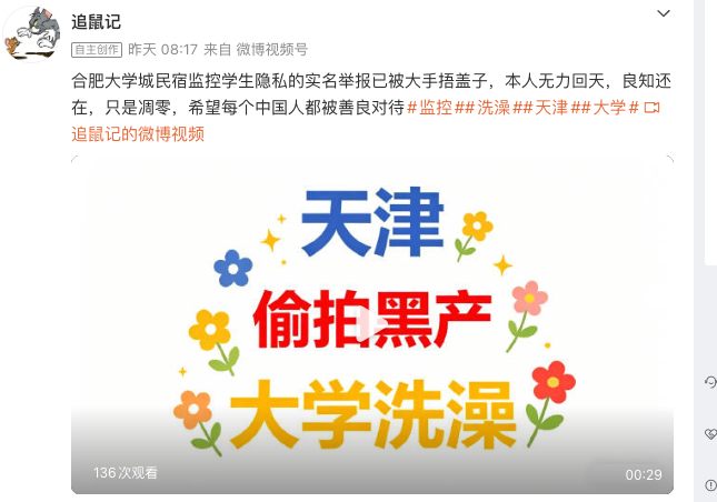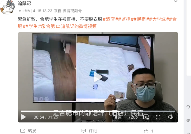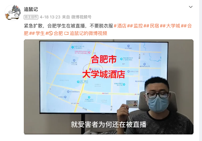 4月18日,反針孔攝影機博客「追鼠記」手持身份證,在社交網絡平台實名舉報稱,安徽合肥市瑤海區文忠路附近一名為「靜語軒小舍」的民宿酒店多房間有針孔攝影機,並朝著床的位置直播。該博客稱,由於近日為專升本考試期間,入住學生較多,他已在違法網站發現疑似學生私隱被洩露。