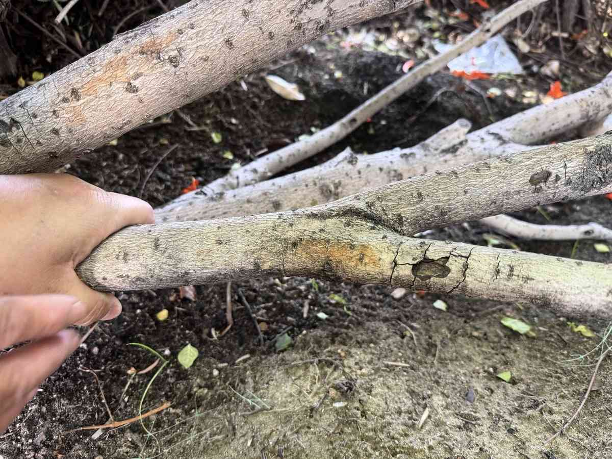 很快,四輛警車抵達現場,將疑犯抓上了警車,並將其行兇工具一併帶走,樹枝已經因用力過猛而斷裂。