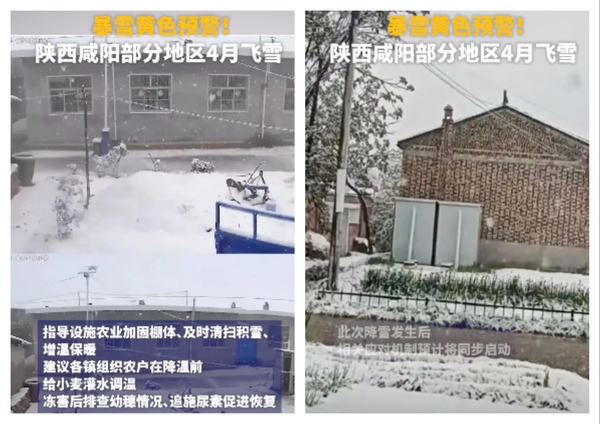 周二(4月21日)上午,陝西寶雞、銅川、咸陽等地突降鵝毛大雪,咸陽旬邑縣、長武縣、彬州市等北部縣區降雪明顯,部份區域積雪顯著。