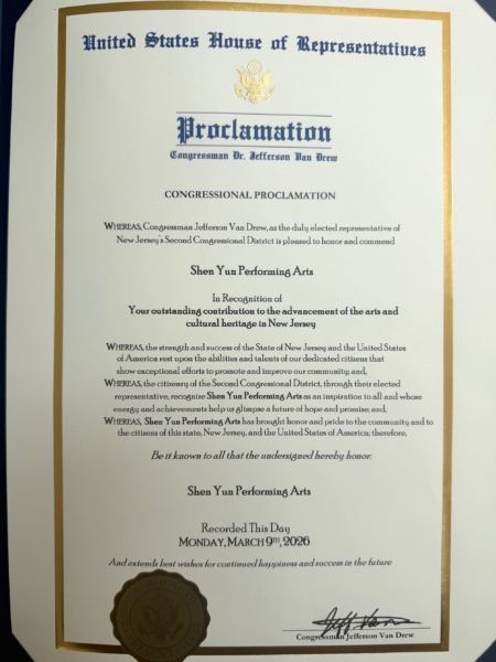 第2選區聯邦眾議員傑斐遜‧范德魯(Jefferson Van Drew)在褒獎決議中稱讚:「神韻藝術團激勵了大家,她的能量與成就讓我們看到未來的希望與憧憬;為社區、為新澤西以及美國帶來了尊榮與驕傲。」
