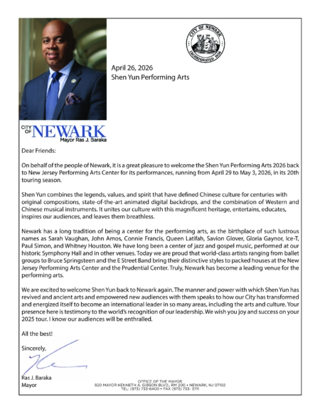 紐瓦克市長拉斯‧巴拉卡(Ras J. Baraka)發來賀信,歡迎神韻藝術團再次蒞臨紐瓦克。信中寫道:「神韻演出以原創編舞、現場交響樂、動態天幕和中西樂器的結合,展現了中國數千年文化的傳奇、價值觀和精神,寓教於樂、啟迪人心,讓人歎為觀止。」
