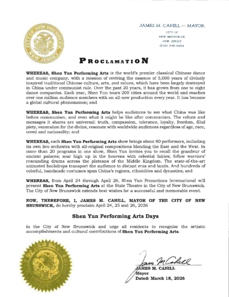 新布朗斯維克(New Brunswick)市長詹姆斯‧卡希爾(James M. Cahill)寫信歡迎神韻再次蒞臨該市,並頒發褒獎,鼓勵市民們抓住機會,一睹神韻風采,共享難忘的藝術。