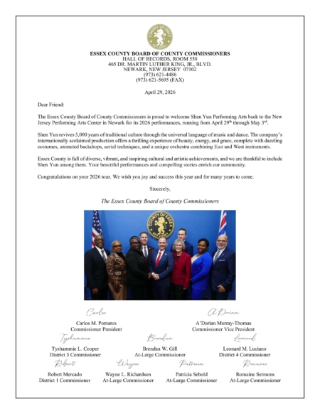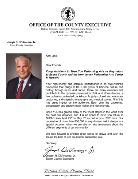 雅息士郡縣(Essex County)行政長官小約瑟夫‧迪文森佐(Joseph N. DiVincenzo, Jr.)在賀信中稱讚神韻藝術團「高能量、層次豐富的精彩演出震撼人心,通過音樂與舞蹈將五千年悠久的中華文化與歷史栩栩如生地呈現在觀眾面前」;「過去二十年來,神韻先後登上了世界眾多最負盛名的藝術殿堂,享譽國際。值此2026年全球巡迴演出之際,神韻將於4月29日至5月3日榮耀重返新澤西表演藝術中心(NJPAC),我們深感無比榮幸與欣喜。」