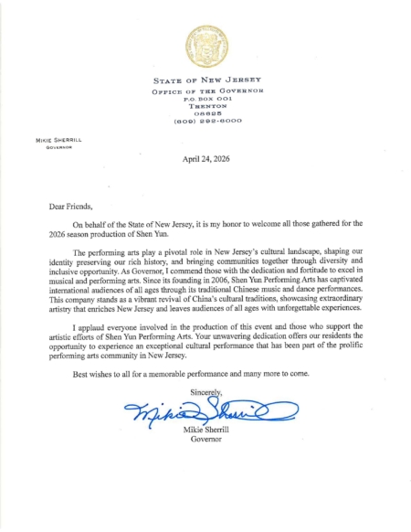 州長米基‧謝里爾(Mikie Sherrill)在賀信中說,「自2006年成立以來,神韻藝術團通過中國傳統音樂與舞蹈演出,深深吸引了各個年齡層的國際觀眾。該藝術團生動地復興了中華文化傳統,展現了非凡的藝術造詣,不僅豐富了新澤西州的文化生活,也為不同年齡的觀眾帶來了難以忘懷的體驗。」