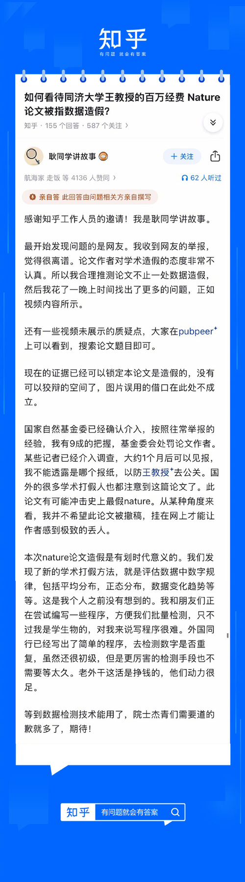 隨後,「耿同學講故事」在知乎發帖說,現在的證據已可以鎖定本論文造假,沒有狡辯空間,圖片誤用藉口不成立。國家自然基金委已確認介入,按照往常舉報經驗,有九成把握,基金委會處罰論文作者。