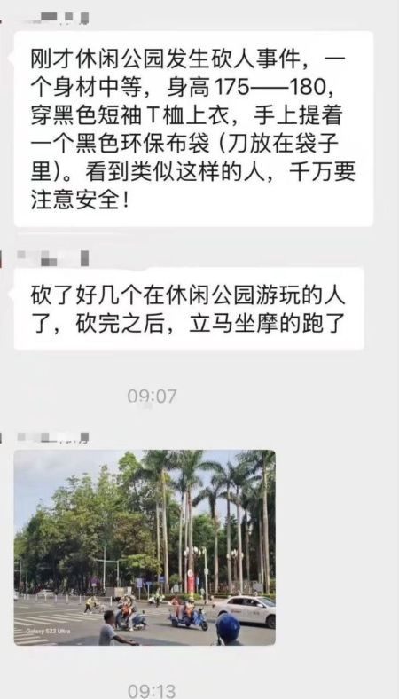 一聊天截圖裏網民寫道:「剛才休閑公園發生斬人事件,(兇手是)一個身材中等(的人),身高175—180(厘米),穿黑色短袖T恤上衣,手上提著一個黑色環保布袋(刀放在袋子裏)。看到類似這樣的人,千萬要注意安全!砍了好幾個在休閑公園遊玩的人,砍完之後立馬坐摩的跑了。」