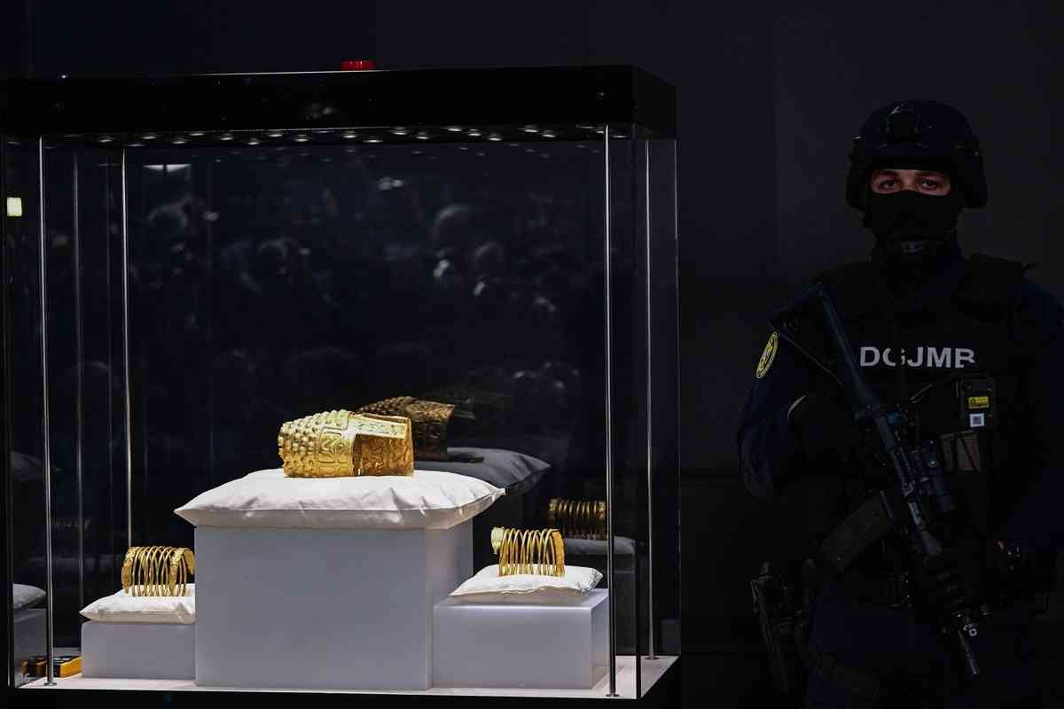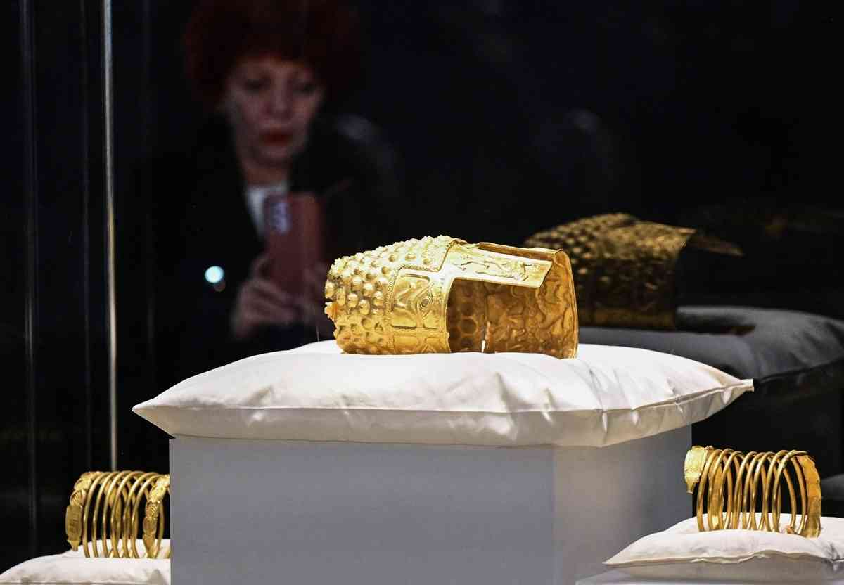 綜合媒體報道,周二,羅馬尼亞國家歷史博物館(MNIR)展出了失而復得的黃金頭盔和兩隻金手鐲。現場由武裝警力戒備,氣氛嚴肅。