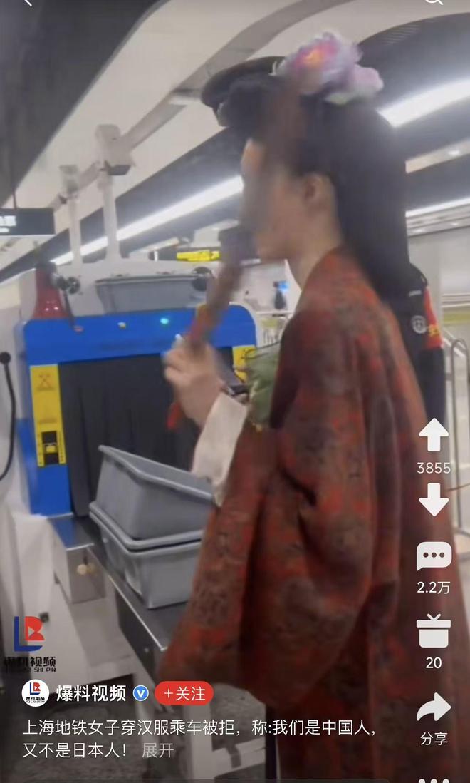 4月20日,一名穿著唐制漢服的女子發布影片吐槽稱:在上海乘坐地鐵時,被工作人員攔下,表示穿著「奇裝異服」不能坐地鐵。