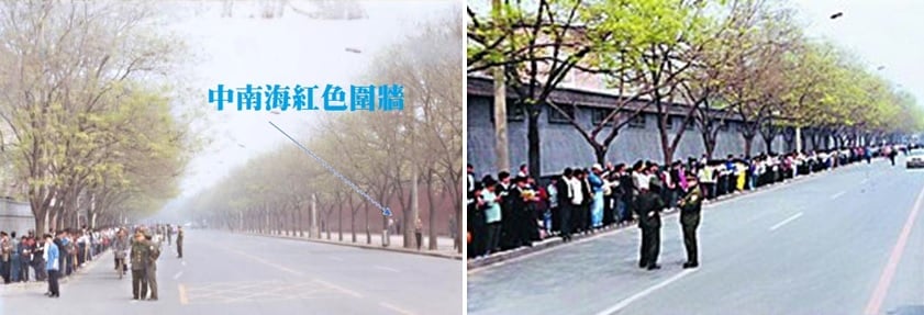 右圖:上訪的法輪功學員沒有站在中南海圍牆的一側,而是隔著府右街與之隔街相望。警察守在他們的前面,還有許多警察把守在中南海西門入口處,毫無圍攻中南海的跡象。